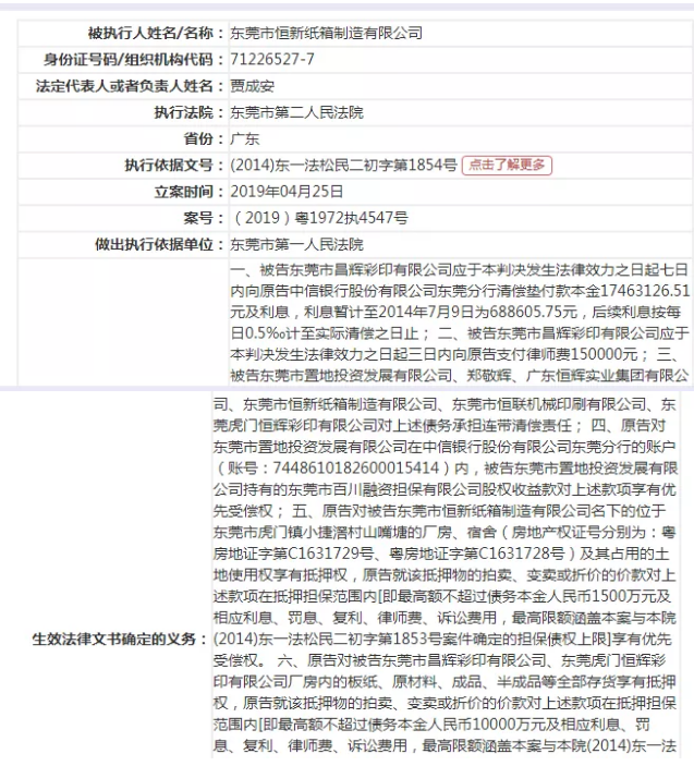 涉案金額上千萬的有兩家紙箱廠。一家名為東莞市恒新紙箱制造有限公司,涉案金額超1800萬元,主要是為東莞市昌輝彩印有限公司拖欠中信銀行東莞分行的一筆欠款承擔連帶清償責任。