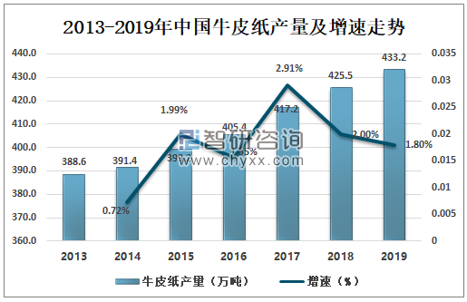 數據來源:智研咨詢整理 二、現狀 牛皮紙成品在環保領域的優勢是毋庸置疑的,牛皮紙包裝在回收再利用上展現了其他包裝材質不具備的優勢。限塑令的提出更加推動牛皮紙行業的發展,從2015開始到2019年牛皮紙產量逐年遞增。2019年中國牛皮紙產量約為433.2萬噸,同比增加1.8%。 2013-2019年中國牛皮紙產量及增速走勢
