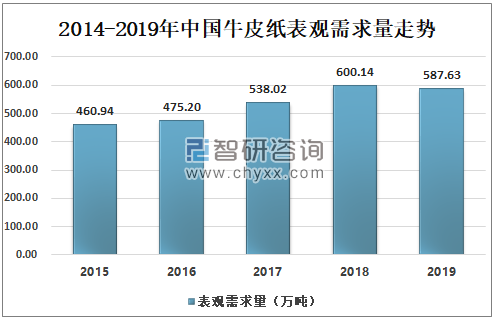 數據來源:中國海關、智研咨詢整理 隨著人們生活水平提高,對環境要求越來越高,牛皮紙需求量也隨之上漲。2019年中美貿易戰對整個牛皮紙產品鏈造成了一定的影響,使得市場上信心不足,稍微低落。2019年中國牛皮紙需求量約為587.63萬噸。 2014-2019年中國牛皮紙表觀需求量走勢