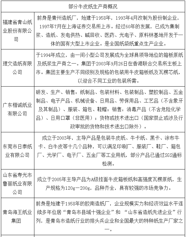 數據來源:智研咨詢整理 限塑令的提出推動了牛皮紙行業的發展,對于環境保護作出了一定的貢獻。國內生產牛皮紙的企業數量較多,主要分布在國內東部地區,以廣東、江浙、福建、山東為主要生產區域。 部分牛皮紙生產商概況