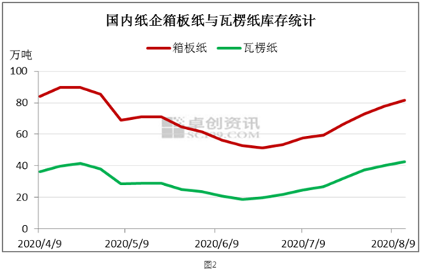 由于原紙需求減少,紙企原紙庫存也在大幅增加。根據卓創資訊統計的49家樣板紙企的箱板原紙周度庫存看,從7月2日當周箱板原紙增加以來,截止8月13日當周,瓦楞原紙庫存增加幅度近60%。而瓦楞紙周度庫存較6月18日當周的年內低點增加了128%。包裝原紙庫存大幅增加的原因一方面是,國內紙企的開工率保持相對高位;另一方面是則是下游原紙需求減弱,紙企原紙由主動補庫存快速轉化為被動補庫存。 對于紙企而言,由于廢紙原料價格相對堅挺,而成品紙需求疲弱,價格下行,其造紙利潤也受到了很大的擠壓。持續攀升的原紙庫存,也使得紙企的資金鏈受到較大沖擊。如果需求依然沒有好的改善,那么紙企可能進入主動去成品紙庫存階段。在這個過程中,紙企的包裝原紙價格競爭壓力將加大,同時也不排除紙企降低開工負荷,這將對廢紙原料也形成一定的下行壓力。