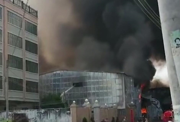 從圖片可以看到,現場濃煙滾滾,黑煙直沖云霄,消防人員正在開展救援。