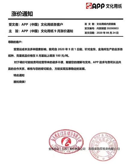 APP文化用紙:受營運成本及多種因素影響,我司自2020年9月1日起,針對金東、金海所生產的全系列各種紙、克重紙品價格在8月基礎上調漲100元/噸。