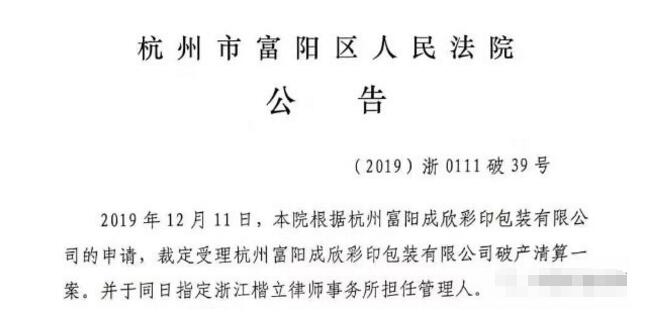 近日,杭州市富陽區人民法院作出《民事裁定書》,裁定宣告杭州富陽成欣彩印包裝有限公司破產。該企業成立于2008年,經營范圍包括紙制品加工,紙箱、紙盒及包裝材料銷售等。 據了解,從2018年起,杭州富陽成欣彩印包裝有限公司就面臨資金緊張的問題。據天眼查信息顯示,該企業曾被多家供應商及金融機構告上法庭,公司負責人也曾被限制消費。 2019年12月份,杭州市富陽區人民法院裁定受理杭州富陽成欣彩印包裝有限公司破產清算案,并于同日指定浙江楷立律師事務所擔任杭州富陽成欣彩印包裝有限公司管理人。