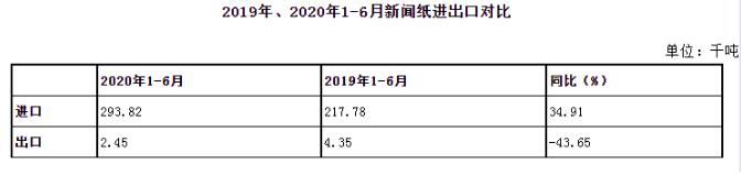 進出口方面,海關(guān)數(shù)據(jù)顯示,2020年1-6月新聞紙進口293.82千噸,同比2019年上半年增加34.91%。1-6月累計出口量2.45千噸,同比2019年1-6月減少43.65%。出口量寥寥,對市場影響不大,進口量增加較多,利空國內(nèi)市場。