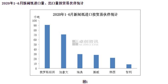 由上圖可見,新聞紙進口2020年上半年按貿(mào)易伙伴統(tǒng)計中,俄羅斯占據(jù)首位,進口量91.15千噸,占比高達31.02%,其次為加拿大,進口量71.25千噸,占比24.25%。進口量前6位的貿(mào)易伙伴占總進口量的85.54%。