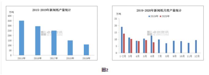 據(jù)國家統(tǒng)計局數(shù)據(jù)顯示,近年來新聞紙產(chǎn)量呈現(xiàn)逐年下降的趨勢,且下調(diào)幅度較大。2020年1-6月累計產(chǎn)量50.3萬噸,同比下滑18.9%。