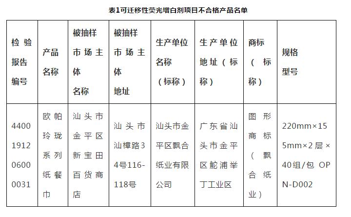 2020年8月24日,廣東省市場監督管理局官網公布2019年度生活用紙產品質量監督抽查情況。 本次共抽查了155家企業生產的200款生活用紙產品,涉及廣東省廣州、深圳、珠海、汕頭、佛山、韶關、惠州、東莞、中山、江門、陽江、揭陽等12個地市以及北京、上海、江蘇、浙江、福建、山東、湖南、廣西等8個省(自治區、直轄市)。 經檢驗,發現4家企業生產的4款產品不合格。不合格項目主要有“可遷移性熒光增白劑”“縱向濕抗張強度”“細菌菌落總數”“滲入量”“滲透性能(滑滲量)”等。 (一)可遷移性熒光增白劑:本次抽查判定1款產品可遷移性熒光增白劑項目不合格。該項目主要考核生活用紙中是否存在違規添加熒光增白劑的情況。該項目不合格,代表添加了熒光增白劑,該物質不易被人體分解、排出,易在體內堆積造成細胞無法正常生長發育。可遷移性熒光增白劑項目不合格產品名單見表1。