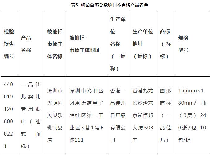 (三)細菌菌落總數:本次抽查判定1款產品細菌菌落總數項目不合格。該項目主要考核生活用紙被細菌污染的程度和衛生狀況。該項目不合格將增加危害人體健康的幾率,可能引起腹瀉、損傷肝臟等身體器官的情況。細菌菌落總數項目不合格產品名單見表3。