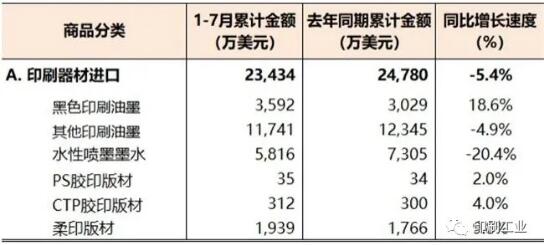 印刷裝備子項出口,計算機直接制版機2053萬美元,同比下降42.1%;膠印機5765萬美元,同比下降0.3%;凹印機1740萬美元,同比下降38.0%;柔印機3319萬美元,同比下降20.4%;絲印機3277萬美元,同比下降33.3%;數字印刷機出口3.31億美元,同比下降24.8%;印刷輔機和零件9087萬美元,同比下降19.2%;書刊裝訂設備1426萬美元,同比下降20.6%;包裝印后設備1.92億美元,同比增長3.8%。 國內印刷器材進出口概況 2020年1月—7月,國內印刷器材進口2.34億美元,同比下降5.4%(參見表6)。其中,黑色印刷油墨1084千克,3592萬美元(同比增長18.6%);其他印刷油墨4870千克,1.17億美元(同比下降4.9%);水性噴墨墨水3121千克,5816萬美元(同比下降20.4%);PS膠印版材0.96萬平方米,35萬美元(同比增長2.0%);CTP膠印版材10.38萬平方米,312萬美元(同比增長4.0%);柔印版材34.12萬平方米,1939萬美元(同比增長9.8%)。 表6 2020年1-7月國內印刷器材進口統計