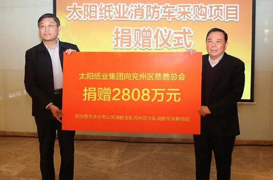 為扶貧、救災、文化、教育、體育等公益和慈善事業進行各種形式的捐贈和扶持,累計金額達5000萬元;2008年四川汶川地震,李洪信帶頭捐贈,太陽紙業共捐贈510萬元人民幣;2010年青海玉樹地震后,太陽紙業一次性捐贈200萬元,幫助災區人民重建家園。2018年,太陽集團及其控股子公司向山東省濟寧市兗州區慈善總會捐贈人民幣2808萬元,定向用于濟寧市公安消防支隊兗州區大隊消防車采購項目。