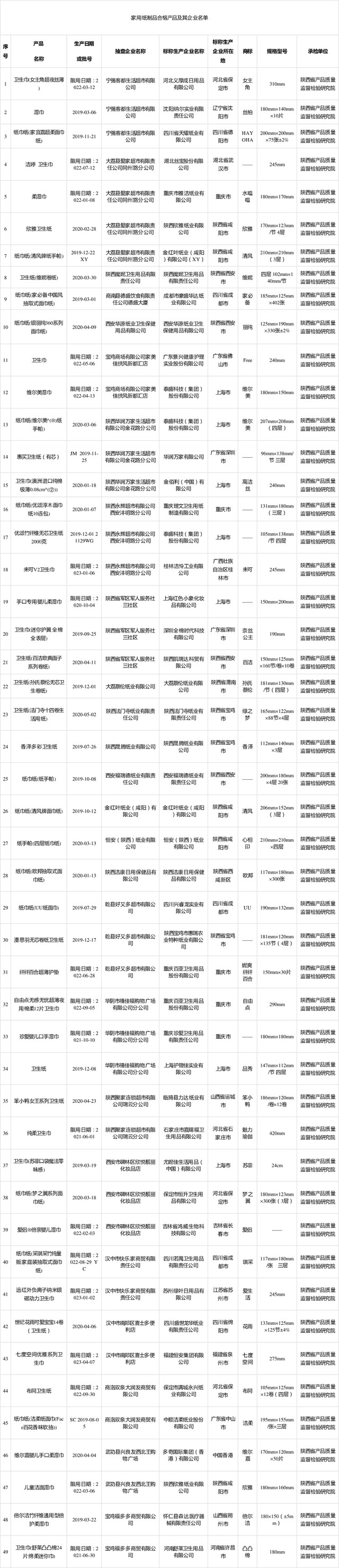 2020年9月7日,陜西省市場監(jiān)督管理局網(wǎng)站公布2020年學生用品等23種產品質量監(jiān)督抽查結果。其中,抽取家用紙制品產品樣品50批次,經(jīng)檢驗,1批次樣品不符合本次監(jiān)督抽查標準要求。 此次家用紙制品產品樣品在西安、渭南、寶雞、咸陽、漢中、商洛、西咸新區(qū)等地區(qū)的生產及流通領域中抽取,共抽查標稱生產企業(yè)45家,抽取樣品50批次。經(jīng)檢驗,合格樣品49批次;1批次樣品不符合本次監(jiān)督抽查標準要求,涉及橫向抗張指數(shù)、縱向濕抗張強度。 此次抽查工作依據(jù)GB/T 20810-2018、GB/T 20808-2011、GB/T 27728-2011、GB/T 8939-2018、GB 15979-2002等相關標準及相關的法律法規(guī)、部門規(guī)章和規(guī)定,對家用紙制品的細菌菌落總數(shù)、大腸菌群、金黃色葡萄球菌、溶血性鏈球菌、真菌菌落總數(shù)、綠膿桿菌、可遷移性熒光增白劑、含液量、包裝密封性、PH、灰分、橫向吸液高度、橫向抗張指數(shù)、抗張指數(shù)、縱向濕抗張強度、柔軟度、塵埃度等項目進行了檢驗。