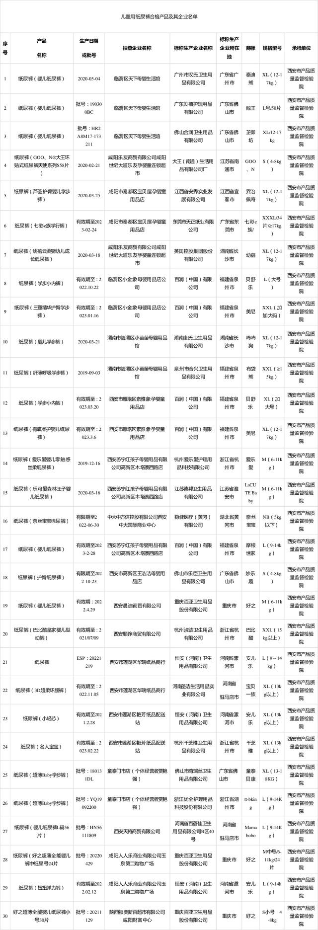 2020年9月7日,陜西省市場監督管理局網站公布2020年學生用品等23種產品質量監督抽查結果。其中,抽取兒童用紙尿褲產品30批次樣品,經檢驗,合格樣品30批次。 此次兒童用紙尿褲產品樣品在西安、咸陽、渭南等地區的流通領域中抽取。共抽查標稱生產企業22家,抽取樣品30批次。依據GB/T 28004-2011/GB 15979-2002等相關標準及相關的法律法規、部門規章和規定,對兒童用紙尿褲的細菌菌落總數、大腸菌群、真菌菌落總數、致病性化膿菌、滲透性能、PH值等項目進行了檢驗。經檢驗,合格樣品30批次。