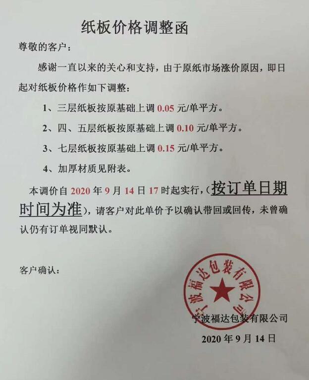 7月14日,寧波福達包裝有限公司發布《紙板價格調整函》,稱由于原紙市場漲價原因,即日起對紙板價格進行如下調整:1.三層紙板按原基礎上調0.05元/單平方;2.四、五層紙板按原基礎上調0.1元/單平方;3.七層紙板按原基礎上調0.15元/單平方…這是9月進入中旬以來浙江乃至全國首家公開的紙板漲價函,在“萬馬齊喑”的紙板市場環境中福達包裝的漲價舉措顯得格外顯眼。