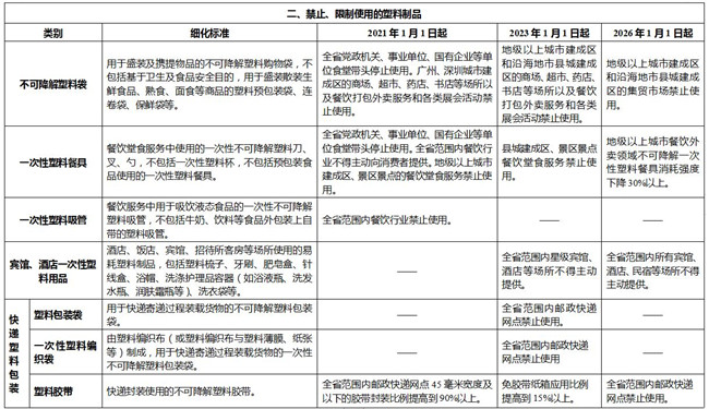 (注:1.該目錄涉及塑料制品類別的細化標準將根據實際執行情況進行動態更新調整。2.在應對自然災害、事故災害、公共衛生事件和社會安全事件等重大突發公共事件期間,用于特定區域應急保障、物資配送、餐飲服務等的一次性塑料制品免于禁限使用。)分時間節點、區域范圍 控制塑料使用 為便于各地執行《省實施意見》,省發展改革委、省生態環境廳制定了《廣東省禁止、限制生產、銷售和使用的塑料制品目錄(2020年版)》,明確了相關禁限細化標準、區域范圍和時間節點。 如厚度小于0.025毫米的超薄塑料購物袋、厚度小于0.01毫米的聚乙烯農用地膜,從今年9月1日起,全省范圍禁止生產、銷售。而一次性發泡塑料餐具、一次性塑料棉簽,從2021年1月1日起,全省范圍禁止生產、銷售。 還明確分區域禁限。2021年1月1日起,廣州、深圳城市建成區的商場、超市、藥店、書店等場所以及餐飲打包外賣服務和各類展會活動,率先禁止使用不可降解塑料袋。而從2023年1月1日起,擴大到地級以上城市建成區和沿海地市縣城建成區的商場、超市、藥店、書店等場所以及餐飲打包外賣服務和各類展會活動禁止使用。 再如,從2021年1月1日起,對于一次性塑料餐具,全省黨政機關、事業單位、國有企業等單位食堂帶頭停止使用。全省范圍內餐飲行業不得主動向消費者提供。地級以上城市建成區、景區景點的餐飲堂食服務禁止使用。而從2023年1月1日,擴大到縣城建成區、景區景點餐飲堂食服務禁止使用。 此次名錄也提出特殊情況,在應對自然災害、事故災害、公共衛生事件和社會安全事件等重大突發公共事件期間,用于特定區域應急保障、物資配送、餐飲服務等的一次性塑料制品免于禁限使用。