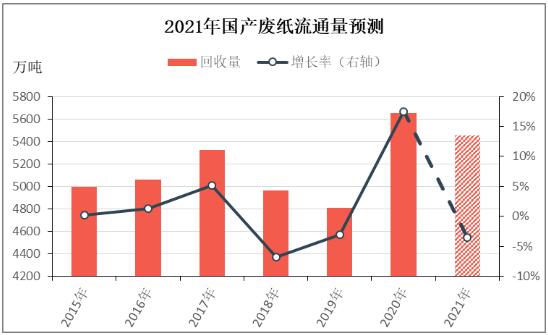 據(jù)卓創(chuàng)資訊數(shù)據(jù)顯示,2020年國產(chǎn)廢紙流通量為5652萬噸,同比增加17.51%,預計2021年國產(chǎn)廢紙流通量在5450萬噸,同比減少3.57%。2021年國內(nèi)出口及消費仍將面臨壓力,廢紙回收基數(shù)不易增長。