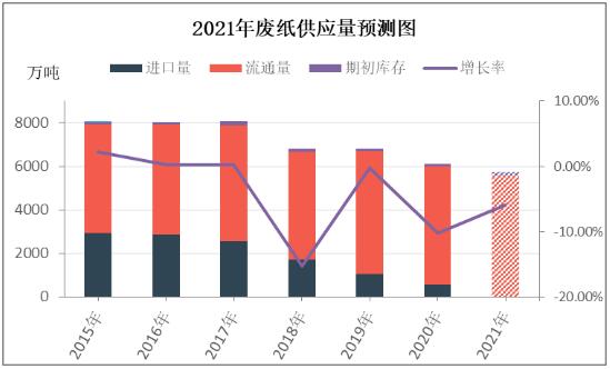 進口廢紙數(shù)量將依照固體廢物進口管理改革的政策而在2021年實現(xiàn)零進口,其將主導2021國內(nèi)廢紙供應量變化趨勢,2020年國內(nèi)廢紙供應量為6110萬噸,同比減少10.25%,預計2021年國內(nèi)廢紙供應量約為5750萬噸,同比減少5.89%。
