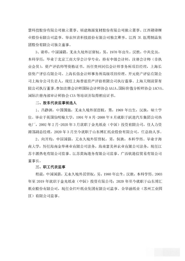 鑒于山東博匯紙業股份有限公司(以下簡稱“公司”)間接控股股東已變更為金光紙業(中國)投資有限公司(以下簡稱“金光紙業”),公司董事會、監事會擬提前進行換屆。
