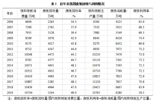 瓦楞紙方面,與2019年10月上旬的3296.7元/噸的價格相比,上漲370元,同比漲幅11.22%。 紙漿方面,與2019年10月上旬的4176.2元/噸的價格相比,下跌179.2元,同比跌幅4.29%。 盡管十月上旬瓦楞紙價格已經呈現出下跌趨勢,但相比廢紙市場突然呈現的價格全面下滑,瓦楞紙的跌幅還是比較微弱,價格還算是平穩運行的。 單是10月11-13日兩天內,廢黃板紙市場收購均價下跌就十分明顯。13月13日為2102.86元/噸,與0月11日的2144.29元/噸相比下調了41.43元/噸,下降了1.93%。 當前廢紙、原紙、紙板的價格走勢并沒有呈現“正態分布”,但可以預見的是,這一波廢紙價格下跌,勢必會對紙板漲價帶來一定的消減。 以下援引造紙信息雜志《2019年我國廢紙回收利用概況》,幫助諸位看官了解廢紙和紙價關系走向,對當前紙箱原料市場分析起到幫助作用。 01、廢紙回收率與廢紙利用率 2019年我國廢紙回收量為5244萬噸,較2018年增長了5.64%。2019年我國廢紙回收率為49.0%,較上一年度增加了1.4%,創歷史新高。在廢紙利用方面,2019年我國廢紙消耗量大幅減少,為6280 萬噸,較2018年的6667萬噸再次下降了5.80%。2019年我國廢紙利用率為58.3%,較2018年再次減少5.6%。我國的廢紙利用率曾較高,達到世界較高水平,最高時在2009年達到74.4%,但近幾年逐年呈下降趨勢。