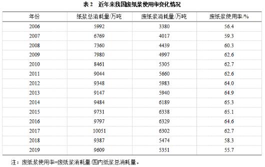 近年來,隨著廢紙回收及資源化綜合利用政策的出臺,有力推動了我國廢紙回收利用行業的規范與整合,推動行業技術裝備水平的提升。尤其是在廢紙進口限制后,在普遍提高國內廢紙采購品質標準,玖龍、山鷹等國內造紙企業不斷調整廢紙采購策略,部分企業還與一些廢紙分揀加工企業合作,這使我國的廢紙回收質量在總體上不斷提高。 02、廢紙漿利用率 廢紙一直是支撐我國造紙工業發展的重要纖維原料,隨著我國造紙原料結構的不斷調整,雖然廢紙漿使用率在2014年以后逐年下降,與2019年相比2018年再次下降了2.6%,但仍達55.7%。