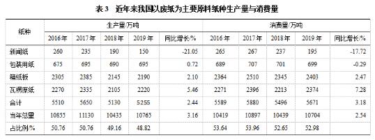 03、以廢紙為主要原料紙種的產量與消費量 2019年全國紙及紙板生產量10765萬噸,較2018年增長3.16%。消費量10704萬噸,較2018年增長2.54%。其中,我國以廢紙為主要原料的紙及紙板產品主要有箱紙板、瓦楞原紙、包裝用紙、新聞紙及部分的白紙板(主要是灰底白紙板)、未涂布印刷書寫紙、廁用衛生紙。 近兩年由于廢紙進口受限,廢紙原料供應趨緊且價格大幅上漲,部分產品原料結構中的廢紙比重在不斷減少或被其他產品所代替。以白紙板中的灰底白紙板為例,其主要原料是混合廢紙,伴隨著2018年1月起我國全面禁止混合廢紙進口及大量位于富陽及東莞地區的中小型灰底白紙板等涂布白紙板生產企業關停,使我國灰底白紙板產量大幅下滑,部分被白卡紙產品所替代。 表3中僅對以廢紙為主要原料的新聞紙、包裝用紙、箱紙板和瓦楞原紙4個品種生產量及消費量進行統計。 2019年這4種產品的生產量合計為5255萬噸,較上年增長2.44%,占當年紙和紙板年總生產量的48.82%。2019年這4種產品的消費量合計為5671萬噸,較上年消費量增長2.54%,占當年紙和紙板總消費量的52.98%。