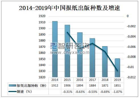 報紙是以刊載新聞和時事評論為主的定期向公眾發行的印刷出版物或電子類出版物。是大眾傳播的重要載體,具有反映和引導社會輿論的功能。 一、報紙發展現狀 隨著網絡的高速發展,看報和看書的成本都是大于網絡閱讀的。我國報紙出版種數逐年下降,2018年中國報紙出版種數1871種,較上年減少13種,同比下降0.69%;2019年中國報紙出版種數1851種,較上年減少20種,同比下降1.07%。 2014-2019年中國報紙出版種數及增速