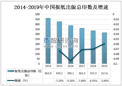 資料來源:中國統計年鑒、智研咨詢整理 近年來,在新媒體的強大沖擊下,報紙減版或者停刊已是很普遍的事實。2014年以來我國報紙出版總印數逐年下滑,2018年中國報紙出版總印數337.3億份,同比下降6.95%;2019年中國報紙出版總印數317.6億份,同比下降5.84%。 2014-2019年中國報紙出版總印數及增速