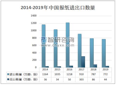 資料來源:中國統計年鑒、智研咨詢整理 我國報紙進口數量明顯大于出口數量,但進口數量逐年下滑,2018年中國報紙進口數量為787萬冊、份,出口數量86萬冊、份;2019年中國報紙進口數量為772萬冊、份,出口數量44萬冊、份。 2014-2019年中國報紙進出口數量