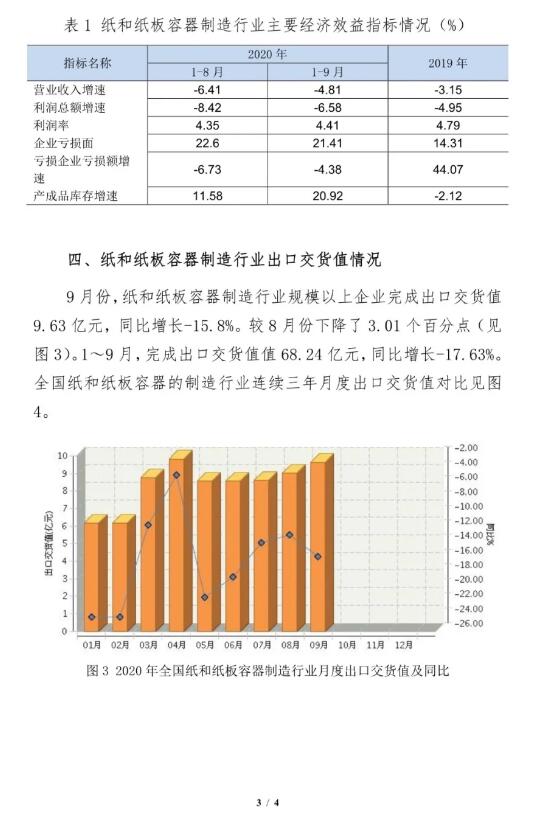 11月16日,中國包裝聯合會公布了2020年9月紙和紙板容器行業經濟運行簡報。數據顯示,9月份,紙和紙板容器制造行業景氣指數為80.15,較8月份上升了0.87個點。同時,指數從過冷區轉入漸冷區運行,景氣度持續向好。 在經營數據方面,1-9月份,全國紙和紙板容器制造行業累計完成營收2037.14億元,同比下滑4.81%;紙和紙板容器制造行業規模以上企業累計實現利潤89.87億元,同比下滑6.58%。 1-9月份,紙和紙板容器制造行業累計虧損面為21.41%,同比增長5.44%。虧損企業虧損額9.62億元,同比下滑4.38%。產成品庫存86.76億元,同比增長20.92%。