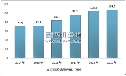 資料來源:智研咨詢整理 我國表面裝飾紙行業(yè)的發(fā)展整體晚于歐美國家。21世紀(jì)以前國內(nèi)表面裝飾紙主要由歐美國家進(jìn)口, 21 世紀(jì)以來在下游需求市場的促進(jìn)下,國內(nèi)部分生產(chǎn)商通過引進(jìn)國外先進(jìn)生產(chǎn)技術(shù)和管理經(jīng)驗(yàn),行業(yè)產(chǎn)品品質(zhì)及產(chǎn)能均得到有效提升,我國從表面裝飾紙進(jìn)口國向出口國轉(zhuǎn)變。 智研咨詢發(fā)布的《2021-2027年中國表面裝飾紙行業(yè)競爭格局分析及發(fā)展趨勢預(yù)測報(bào)告》顯示:2014年我國表面裝飾紙行業(yè)產(chǎn)量70.9萬噸,到2019年增長到了108.5萬噸。近幾年我國表面裝飾紙市場產(chǎn)量情況如下圖所示: 2014-2019年中國表面裝飾紙市場供給情況