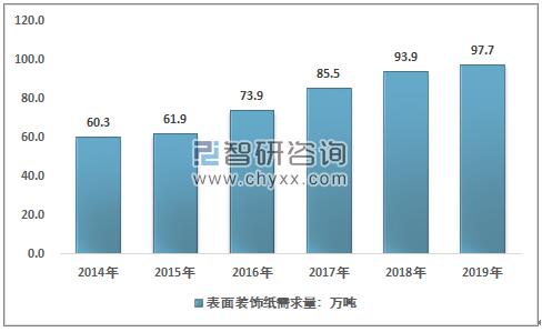 資料來源:智研咨詢整理 2019年我國表面裝飾紙需求量97.7萬噸,同比2018年的93.9萬噸增長了4.05%,近幾年我國表面裝飾紙需求量情況如下圖所示: 2014-2019年中國表面裝飾紙需求量情況