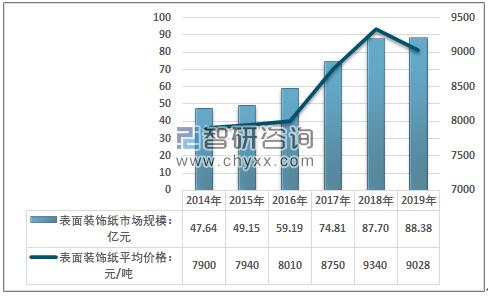 資料來源:智研咨詢整理 目前我國的表面裝飾紙產(chǎn)業(yè)在全球市場上已經(jīng)具有較強(qiáng)的競爭力,產(chǎn)品廣泛出口,國內(nèi)市場需求也總體穩(wěn)定增長。同時(shí)在環(huán)保因素以及國內(nèi)經(jīng)濟(jì)增長作用下,行業(yè)產(chǎn)品價(jià)格出現(xiàn)了高速增長,行業(yè)市場規(guī)模持續(xù)擴(kuò)大,2018年達(dá)到了87.70億元,2019年行業(yè)產(chǎn)品價(jià)格略有回落,需求穩(wěn)定增長,國內(nèi)表面裝飾紙行業(yè)市場規(guī)模達(dá)到了88.38億元,小幅增長。 2014-2019年中國表面裝飾紙產(chǎn)業(yè)市場規(guī)模及其價(jià)格走勢