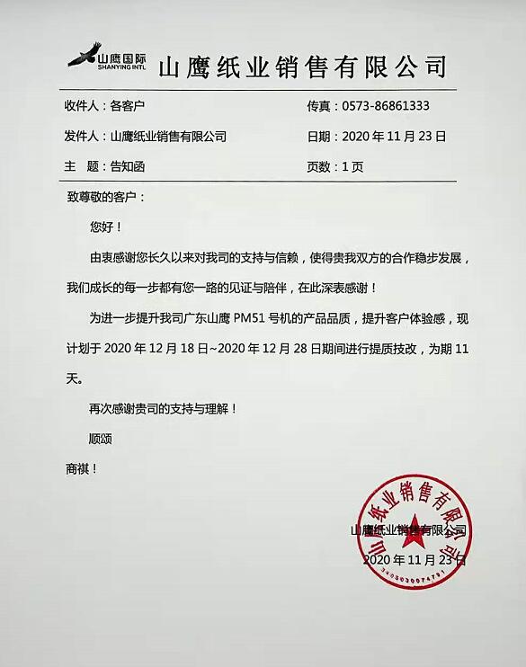 導(dǎo)語:11月23日,山鷹紙業(yè)銷售有限公司先后發(fā)布的一則停機(jī)技改告知函、一則漲價函引起了紙包裝行業(yè)的關(guān)注。
