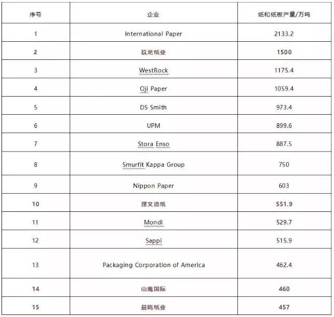 此外,如果按照產能來排位,全球33家紙及紙板產量超過200萬噸的造紙企業名單中,國際紙業排名第一,玖龍紙業和WestRock位列二、三位。有四家中國企業產量進入全球產量前15強,分別是玖龍紙業、理文造紙、晨鳴紙業和山鷹國際。