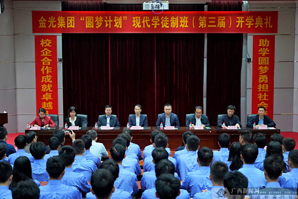 近日,金光集團“圓夢計劃”現代學徒制班開學典禮在廣西工業職業技術學院多功能廳舉行。現場20級學生代表還按照傳統拜師禮儀進行拜師禮,向金光集團技師敬拜師茶、行拜師禮。