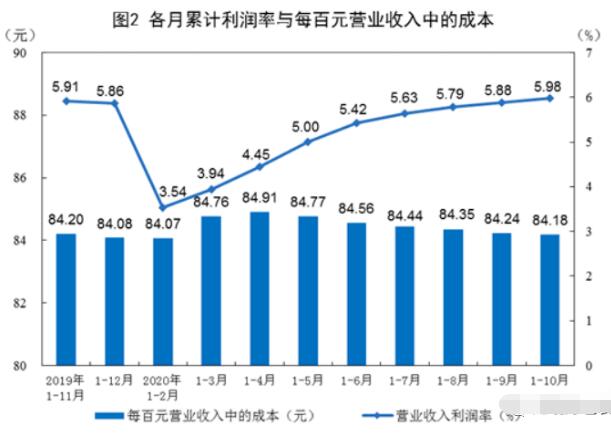 在營(yíng)收方面,1-10月份,全國(guó)規(guī)模以上工業(yè)企業(yè)實(shí)現(xiàn)營(yíng)業(yè)收入83.78萬(wàn)億元,同比下降0.6%;發(fā)生營(yíng)業(yè)成本70.52萬(wàn)億元,下降0.6%;營(yíng)業(yè)收入利潤(rùn)率為5.98%,同比提高0.08個(gè)百分點(diǎn)。