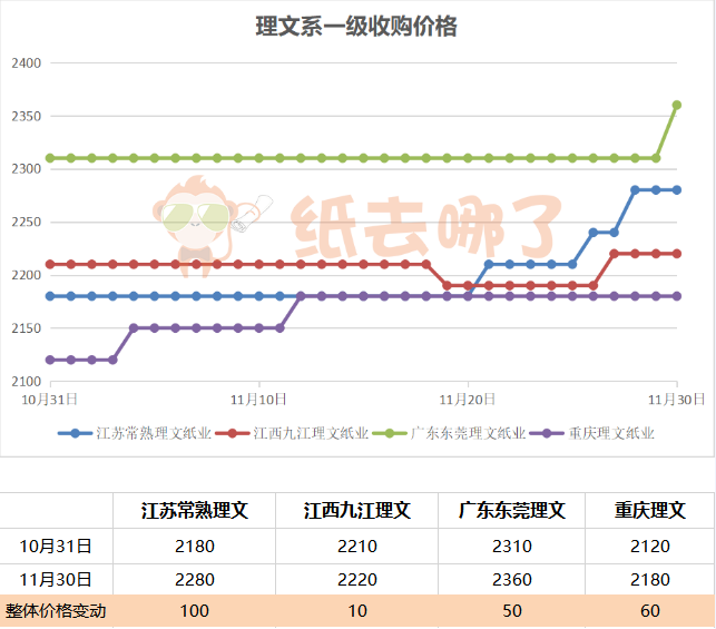 這一政策的出現無疑成為刺激本輪國廢價格回暖的重要因素,消息發出后的短短幾天,國廢價格就迎來了一波上漲大潮,廢紙指數從11月24日的2006.22,到11月30日的2020.63,漲幅達0.72%。 廢紙在“外廢即將徹底清零”的政策烘托下競爭愈發激烈,行業集中度或將進一步提升。而廢紙價格的上揚,也從原料端支撐了原紙價格,能從一定程度上遏制或減緩原紙價格下跌的趨勢。 華東地區以山鷹、理文、玖龍三大規模紙企領漲,以下為三大紙廠本月廢紙走勢圖,從圖中可以看出,三大紙廠的紙價在月底前一周都有不同程度的上漲走勢,且漲勢不減。 山鷹系A級收購價格走勢