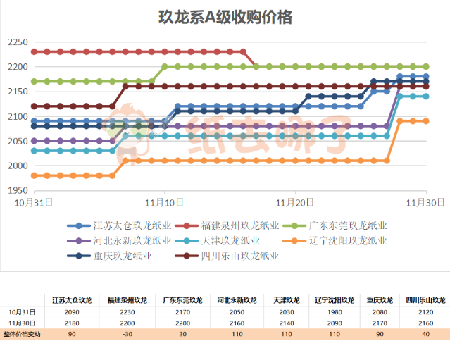 截至11月30日,理文系一級紙以廣東理文最高,為2360元/噸;重慶理文最低,為2180元/噸。 玖龍系A級收購價格走勢