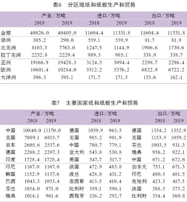3 紙和紙板 3.1 紙和紙板生產(chǎn) 2019年全球紙和紙板產(chǎn)量為40405萬噸,比2018年下降1%。其中,亞洲紙和紙板產(chǎn)量19428.3萬噸,增長1.4%,是唯一實(shí)現(xiàn)增長的區(qū)域;拉丁美洲2229.4萬噸,下降1%;歐洲10284萬噸,下降3%;非洲290萬噸,下降5%;北美洲為7763萬噸,下降4.2%;大洋洲為395.1萬噸,下降0.3%。紙和紙板產(chǎn)量最大的五個國家是中國(11170萬噸)、美國(6815.7萬噸)、日本(2537.6萬噸)、德國(2207.3萬噸)、印度(1728.4萬噸),其他產(chǎn)量較大的國家有印尼、韓國、巴西、芬蘭、瑞典,上述10個國家的合計(jì)產(chǎn)量下降0.7%。 3.2 紙和紙板貿(mào)易 2019年全球紙和紙板出口貿(mào)易量為11331.8萬噸,比2018年下降2.3%。北美和歐洲是紙和紙板凈出口地區(qū),其中北美凈出口量為585.7萬噸,歐洲為1346萬噸。非洲、拉丁美洲、亞洲和大洋洲是紙和紙板凈進(jìn)口地區(qū),其中非洲的凈進(jìn)口量為478萬噸,拉丁美洲為646.4萬噸,亞洲為798萬噸,大洋洲為9.4萬噸。紙和紙板進(jìn)口量最大的五個國家是德國(963.5萬噸)、美國(901.9萬噸)、中國(779.1萬噸)、意大利(530.8萬噸)、英國(517.7萬噸),其他進(jìn)口量較大的國家還有法國、波蘭、墨西哥、比利時、西班牙,上述10個國家的合計(jì)進(jìn)口量下降3.3%。紙和紙板出口量最大的五個國家是德國(1352.9萬噸)、美國(1059.2萬噸)、芬蘭(931.3萬噸)、瑞典(922.1萬噸)、中國(672.6萬噸),其他出口量較大的國家還有加拿大、印尼、奧地利、法國、比利時,上述10個國家的合計(jì)出口量下降3.9%。