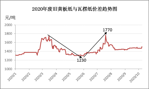 2020年廢舊黃板紙與瓦楞紙市場繼續(xù)維持高度相關關系,價格呈現(xiàn)”M”型的走勢。隨著瓦楞紙市場逐漸回歸理性,受國家對于廢紙清零政策的影響廢紙價格,導致兩者價差繼續(xù)縮窄,年內(nèi)價差在1230-1770元/噸,直至7月中旬兩者價差開始逐漸增大。2020年2月爆發(fā)公共衛(wèi)生事件,在3月份發(fā)酵,引發(fā)全球性公共衛(wèi)生危機,市場恐慌心態(tài)蔓延,市場交投氣氛低迷,廢舊黃板紙與瓦楞紙價格均呈現(xiàn)下滑態(tài)勢,到5月底價差縮小至1230元/噸。進入6月份瓦楞紙市場國內(nèi)公共衛(wèi)生事件好轉(zhuǎn),隨著需求逐步釋放,規(guī)模紙廠大幅拉漲瓦楞紙價格,紙廠開工負荷提升明顯,因此對廢舊黃板紙需求逐步增加,瓦楞紙價格助推原料廢紙價格逐步走高,截至7月份兩者價差增大至1770元/噸,較年內(nèi)最低價差上漲30.51%。隨著瓦楞紙市場交投轉(zhuǎn)為疲軟,瓦楞紙與廢舊黃板紙價格大幅下滑,三季度瓦楞紙與廢舊黃板紙價格表現(xiàn)較為堅挺,兩者價差多震蕩區(qū)間調(diào)整,整體呈穩(wěn)中增加趨勢。
