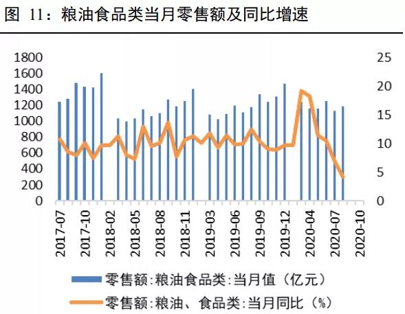 根據山西證券監測:2020年1-10月,糧油、食品類零售額累計值為12422.4億元,同比增長10.4%。10月, 糧油、食品類零售額為1291.4億元,同比增加 8.8%。