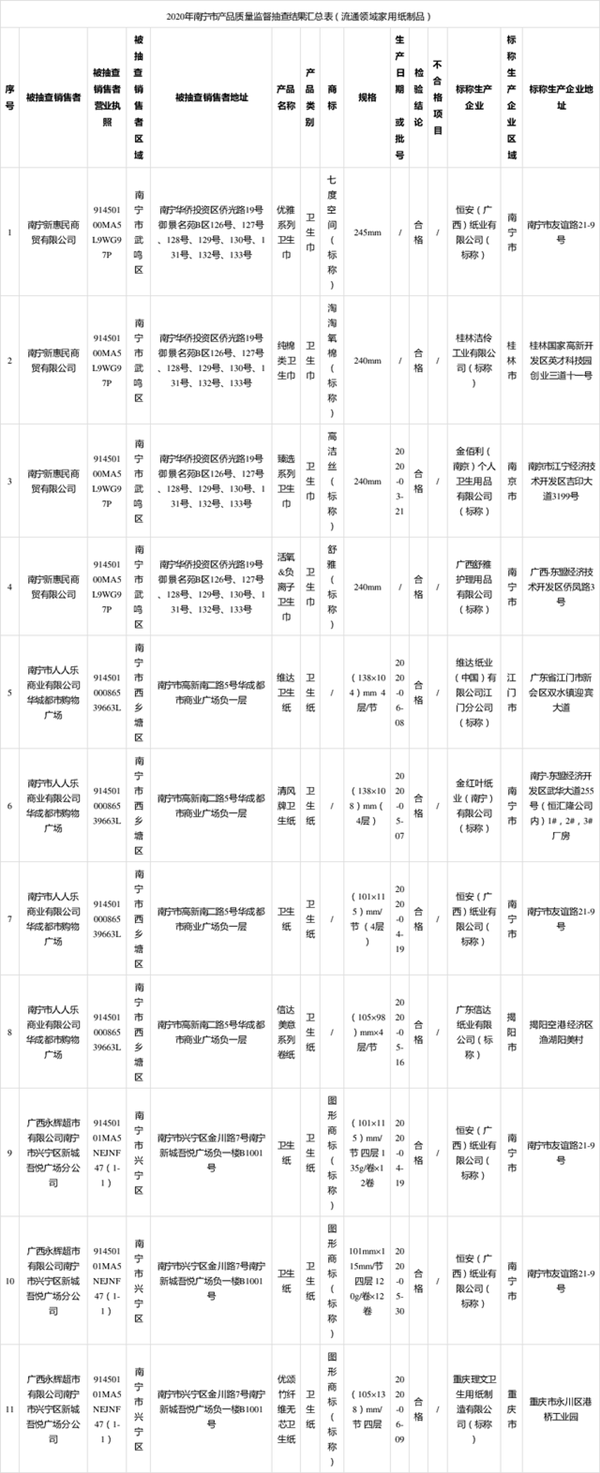 2020年12月31日,廣西南寧市市場監督管理局網站公布2020年家用紙制品產品質量監督抽查情況,共抽查18批次樣品,其中8批次為衛生巾(含衛生護墊)產品、10批次為衛生紙產品。經檢驗,18批次均為合格產品,不合格產品檢出率為0。其中,生產領域共抽取7批次產品,合格7批次,不合格0批次,不合格產品檢出率為0;流通領域共抽取11批次產品,合格11批次,不合格0批次,不合格產品檢出率為0。