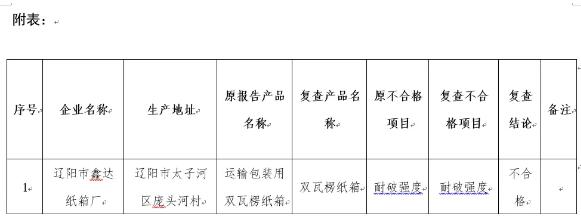 公告稱,根據《中華人民共和國產品質量法》和《產品質量監督抽查管理暫行辦法》的規定,現對遼陽市鑫達紙箱廠產品質量省級監督抽查不合格且經復查仍不合格的情況予以公告。