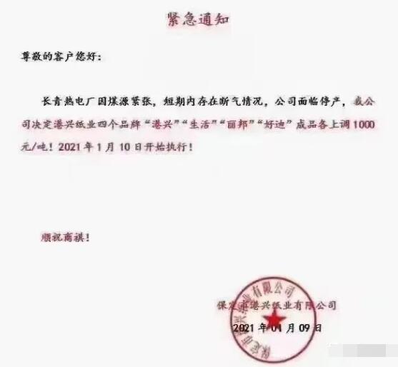 港興紙業(yè):長青熱電廠因煤源緊張,短期內(nèi)存在斷氣情況,公司面臨停產(chǎn)。從1月10日起,港興紙業(yè)四個品牌“港興”、“生活”、“麗邦”、“好迪”成品各上調(diào)1000元/噸。