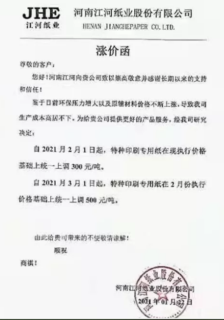 5、河南江河紙業(yè) 鑒于日前環(huán)保壓力增大以及原輔材料價(jià)格不斷上漲,導(dǎo)致我司生產(chǎn)成本高居不下。為給貴公司提供更好的產(chǎn)品服務(wù),經(jīng)我司研究決定: 自2021年2月1日起,特種印刷專用紙?jiān)诂F(xiàn)執(zhí)行價(jià)格基礎(chǔ)上統(tǒng)一上調(diào)300元/噸。 自2021年3月1日起,特種印刷專用紙?jiān)?月份執(zhí)行價(jià)格基礎(chǔ)上統(tǒng)一上調(diào)500元/噸。