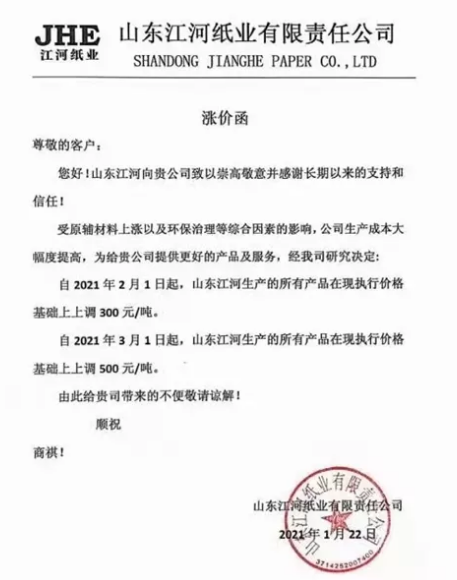 4、山東江河紙業(yè) 受原輔材料上漲以及環(huán)保治理等綜合因素的影響,公司生產(chǎn)成本大幅度提高,為給貴公司提供更好的產(chǎn)品及服務(wù),經(jīng)我司研究決定: 自2021年2月1日起,山東江河生產(chǎn)的所有產(chǎn)品在現(xiàn)執(zhí)行價(jià)格基礎(chǔ)上上調(diào)300元/噸。 自2021年3月1日起,山東江河生產(chǎn)的所有產(chǎn)品在現(xiàn)執(zhí)行價(jià)格基礎(chǔ)上上調(diào)500元/噸。