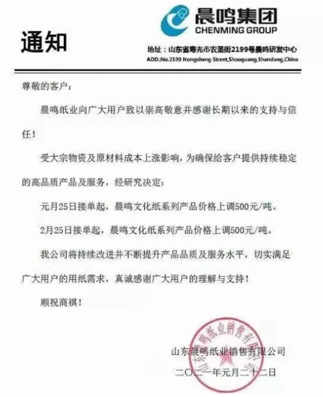 3、山東晨鳴紙業(yè) 受大宗物資及原材料成本上漲影響,為確保給客戶提供持續(xù)穩(wěn)定的高品質(zhì)產(chǎn)品及服務(wù),經(jīng)研究決定: 元月25日接單起,晨鳴文化紙系列產(chǎn)品價(jià)格上調(diào)500元/噸。 2月25日接單起,晨鳴文化紙系列產(chǎn)品價(jià)格上調(diào)500元/噸。