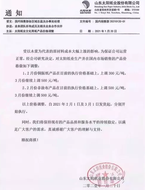 2、太陽(yáng)紙業(yè) 受以木漿為代表的原材料成本大幅上漲的影響,為保證公司運(yùn)營(yíng)正常,經(jīng)公司研究決定,對(duì)太陽(yáng)紙業(yè)生產(chǎn)并在國(guó)內(nèi)市場(chǎng)銷售的產(chǎn)品價(jià)格做如下調(diào)整: 1、2月份銅版紙產(chǎn)品在目前的執(zhí)行價(jià)格基礎(chǔ)上,上調(diào)300元/噸,3月份繼續(xù)上調(diào)500元/噸; 2、2月份非涂布產(chǎn)品在目前的執(zhí)行價(jià)格基礎(chǔ)上,上調(diào)500元/噸,3月份繼續(xù)上調(diào)500元/噸; 以上價(jià)格調(diào)整,自2021年2月1日及3月1日發(fā)貨起,分別開始執(zhí)行。