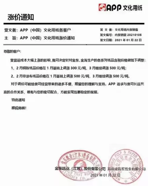 2021年1月20-22日,APP金光集團(tuán)、山東太陽(yáng)、山東紙業(yè)、山東江河、河南江河、山東華泰等紙企紛紛發(fā)布漲價(jià)函,均宣布在2月、3月份均上調(diào)文化紙價(jià)格,漲幅為800-1000元/噸。 1、APP金光集團(tuán)(金東、金海紙廠) 受運(yùn)營(yíng)成本大幅上漲的影響,我司決定針對(duì)金東、金海生產(chǎn)的各系列紙品含稅價(jià)格做如下調(diào)整: 1、2月銅版紙品價(jià)格在1月基礎(chǔ)上調(diào)漲300元/噸,3月繼續(xù)調(diào)漲500元/噸; 2、2月非涂布紙品價(jià)格在1月基礎(chǔ)上調(diào)漲500元/噸,3月繼續(xù)調(diào)漲500元/噸。