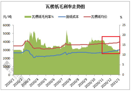 目前生產瓦楞原紙的企業主要原料為廢舊黃板紙、玉米淀粉。 卓創資訊監測數據來看,近期原料面市場走勢較強,是助推紙價調漲的主要動力,但原料的強勢上漲,也是影響紙廠利潤最重要的因素。 原料廢就黃板紙 進入1月份以來,國廢黃板紙到廠價局部連續上漲,紙廠全面開啟春節廢紙備貨計劃,但國內物流運費有所升高,廢紙貨物運力略顯不足,廢紙市場供應難以提升。 此外,北方公共衛生事件略微升級,由于京津冀及東北地區是我國廢紙的一個重要集散地,在管控措施實施后,這些地區的廢紙回收和運輸都受到了較強的限制,使得部分紙廠意向提前完成備貨計劃,由此形成短暫的供小于求市場狀態。 自2021年1月4日至19日,半個月的時間廢紙全國均價上漲133元/噸,漲幅在5.71%。 玉米淀粉 元旦過后,國內玉米及玉米淀粉期現貨市場價格再次突飛猛進,自2021年1月4日至19日,半個月的時間內玉米淀粉現貨價格累計上漲500-700元/噸,漲幅在20.63%,華北地區高端出廠價格升至3900元/噸,創造歷史新高。 原料玉米價格強勢上行,部分淀粉產區突發公共衛生事件影響物流發運受限,玉米供給不足導致淀粉產量受損以及春節備貨提前集中突發性采購增多,深加工企業原料玉米庫存低等,多重利好因素疊加共振影響,玉米淀粉市場跟隨自己基本面及原料玉米價格走勢同比連續上揚,價格升至歷史最高。 卓創監測數據顯示,截至1月19日瓦楞紙毛利率呈下滑態勢,較12月份同期下跌2.63個百分點。 瓦楞紙價格呈上漲趨勢,環比12月同期價格上漲121元/噸,漲幅在3.21%。 而瓦楞主要原料廢舊黃板紙環比12月同期價格上漲150元./噸,漲幅在6.76%。玉米淀粉環比12月同期價格上漲384元/噸,漲幅在11.09%。 綜合原料成本漲幅在6.35%,原料成本上漲幅度大于瓦楞紙價格漲幅,因此紙價上漲,但瓦楞紙行業毛利呈下滑態勢。